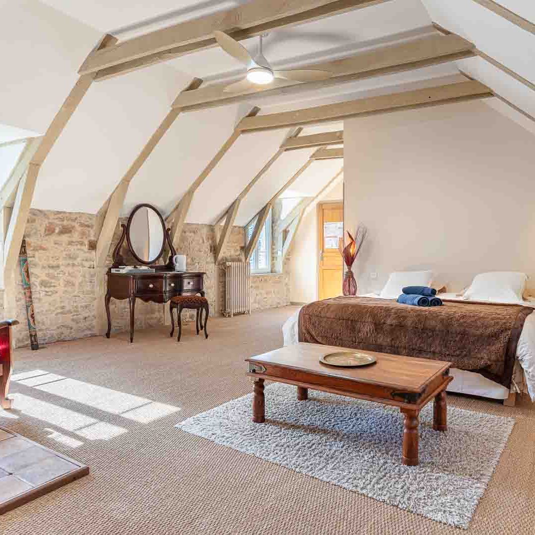 Vous accéderez à la chambre par une entrée qui desservira également le séjour où sont pris petit déjeuner et dîner, ainsi que le salon réservé aux hôtes.